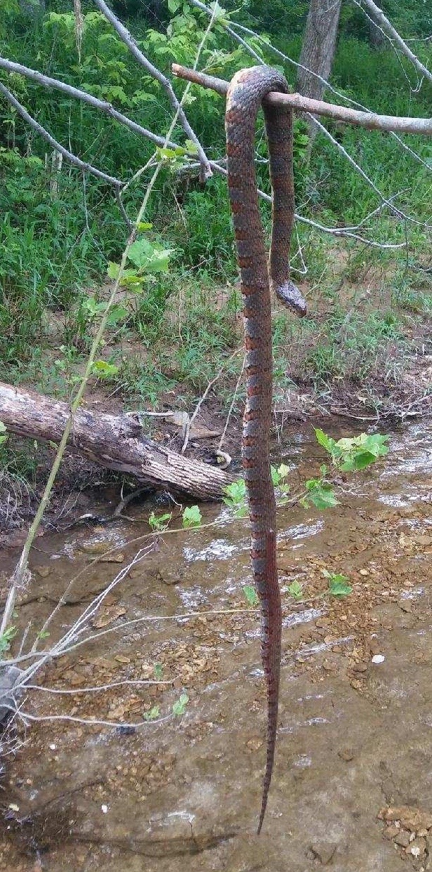 Once my friend Larry Whiteley raced up on an ATV to get my camera. He had seen the snake in the process of swallowing a perch at a creek crossing. We got there just as it was finishing up, patiently working the tail into its mouth as the final bite of a dinner that could last a few weeks. It laid patiently on the edge of the bank until it completely swallowed, then swam leisurely away, satisfied it had entertained us enough.