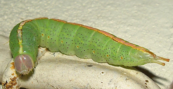 Diving further into photographs in Bugguide I finally found some red lookalikes. Apparently the caterpillars turn color when they are ready to pupate. Looking closely at my photograph you can make out the pale racing stripe remnant down the back. Measuring close to 2", it was a dramatic find.